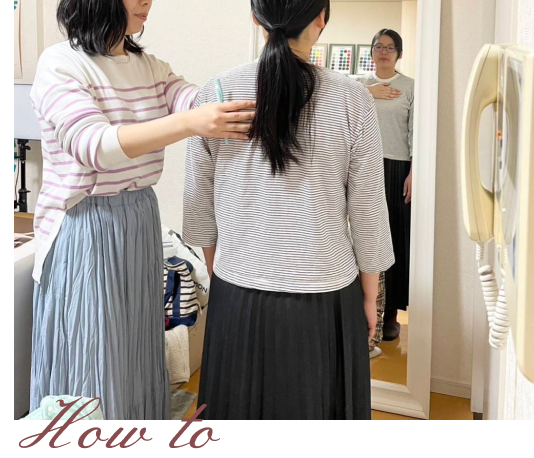 自宅にお伺いorお洋服やアイテムをお持ちいただき、お手持ちの服での組み合わせ提案やコーディネートの幅が広がる買い足しアイテムをご提案します。