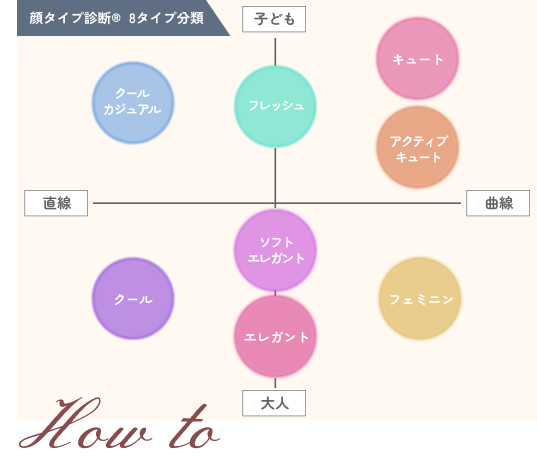 顔タイプ診断は、顔の輪郭やパーツの形・バランスから顔タイプを分析することで、似合うファッションのテイストや髪型等を導く診断です。主に、大人顔/子ども顔/直線的/曲線的の組み合わせからタイプを判定し、「似合う」を理論的に説明します。